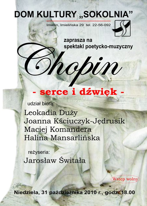 Cały świat obchodzi w tym roku 200 rocznicę urodzin największego polskiego kompozytora Fryderyka Chopina. Dom Kultury również włącza się w obchody tego jubileuszu i zaprasza na monodram słowno-muzyczny pt. "Chopin - muzyka i miłość". W programie fragmenty listów George Sand, przyjaciół i rodziny kompozytora oraz oczywiście muzyka wielkiego Fryderyka. Całość ma formę literacko-muzycznego spektaklu, który wyreżyserował Jarosław Świtała. Występują: Maciej Komandera (w roli Chopina), Joanna Kściuczyk-Jędrusik i Leokadia Duży (recytacje, śpiew) oraz Halina Mansarlińska (fortepian).